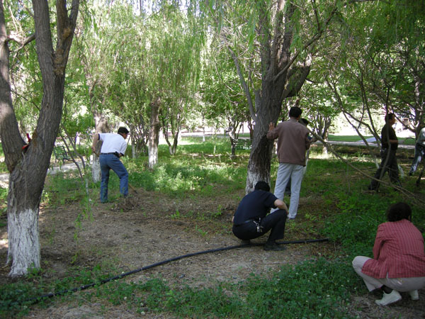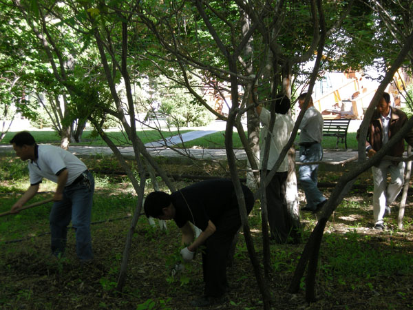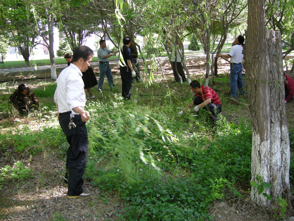 2009年6月4日下午18:00,在机关办公楼东侧绿化地,总务处全体党员、干部、入党积极分子等20多人,顶着炎炎烈日,在总务处党支部的带领下,一场践行科学发展观主题实践活动正在进行,现场一派热火朝天的劳动景象。