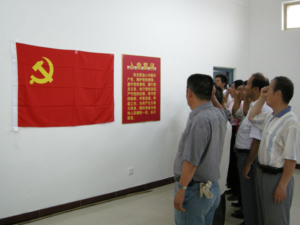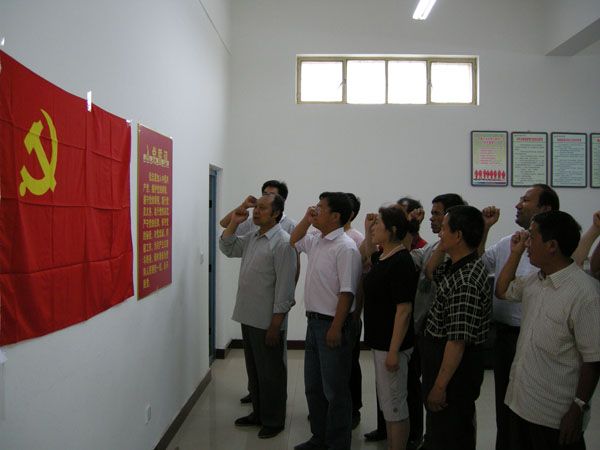 为隆重庆祝中国共产党建党88周年,继承和发扬党的优良传统和作风,进一步加强党的建设,提高党组织的凝聚力、战斗力和号召力,增强广大共产党员的荣誉感和责任感,按照学院党委的统一部署, 2009年6月29日下午,总务处党支部组织全体党员面对党旗,在支部书记夏永辉老师的领誓下,伴随着一声声铿锵有力的誓词,大家举起右手,重温入党誓词,庄严宣誓。